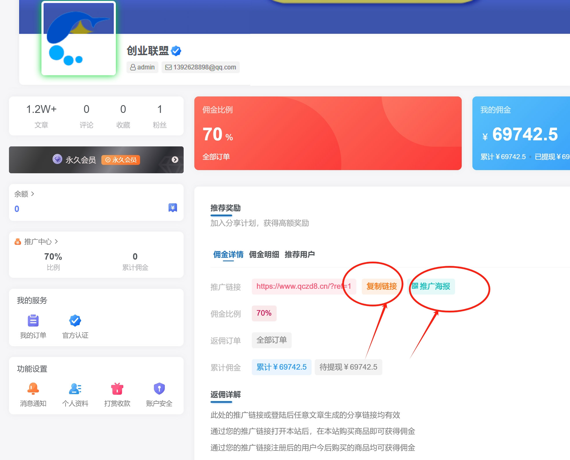 ☁ 在用户中心-推广中心-复制链接或推广海报